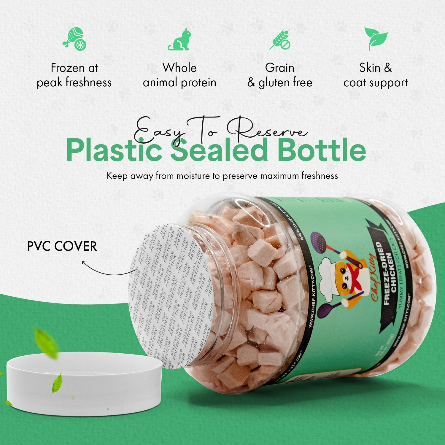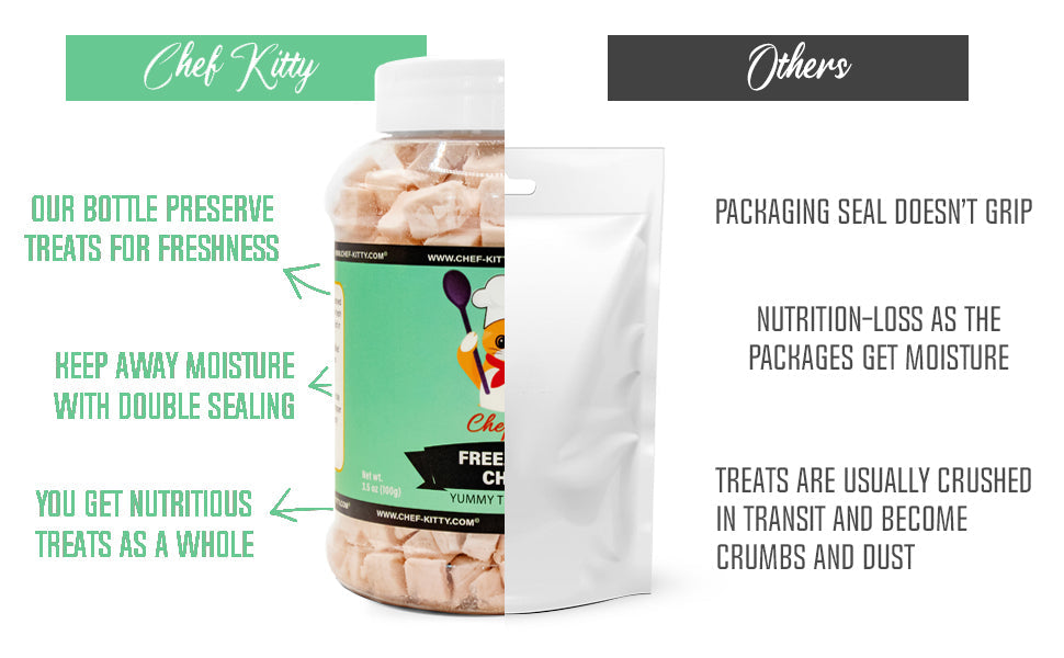 - Chef Kitty Quality - Prepared with the utmost care, our freeze dried chicken cat treats are made with the same raw ingredients worthy of your own dinner plate. Our freeze dried cat treats uses nothing but fresh high-quality, additive-free meat that's easy to digest.